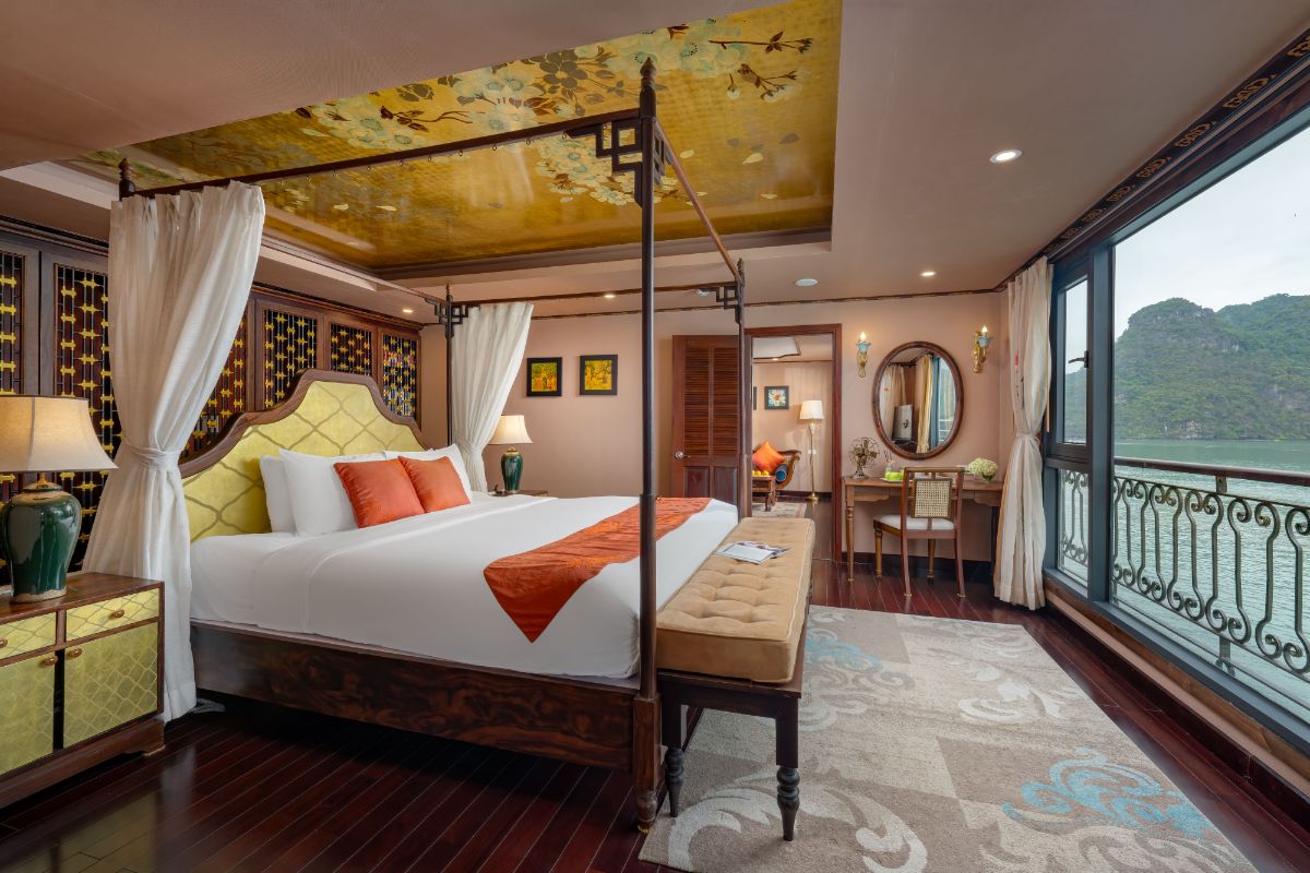 Suites include walk-in closets, elegant bathrooms, LCD TVs, luxury bedding, bathrobes, Wifi, and mini-bars-creating an elevated, serene journey through Lan Ha Bay.