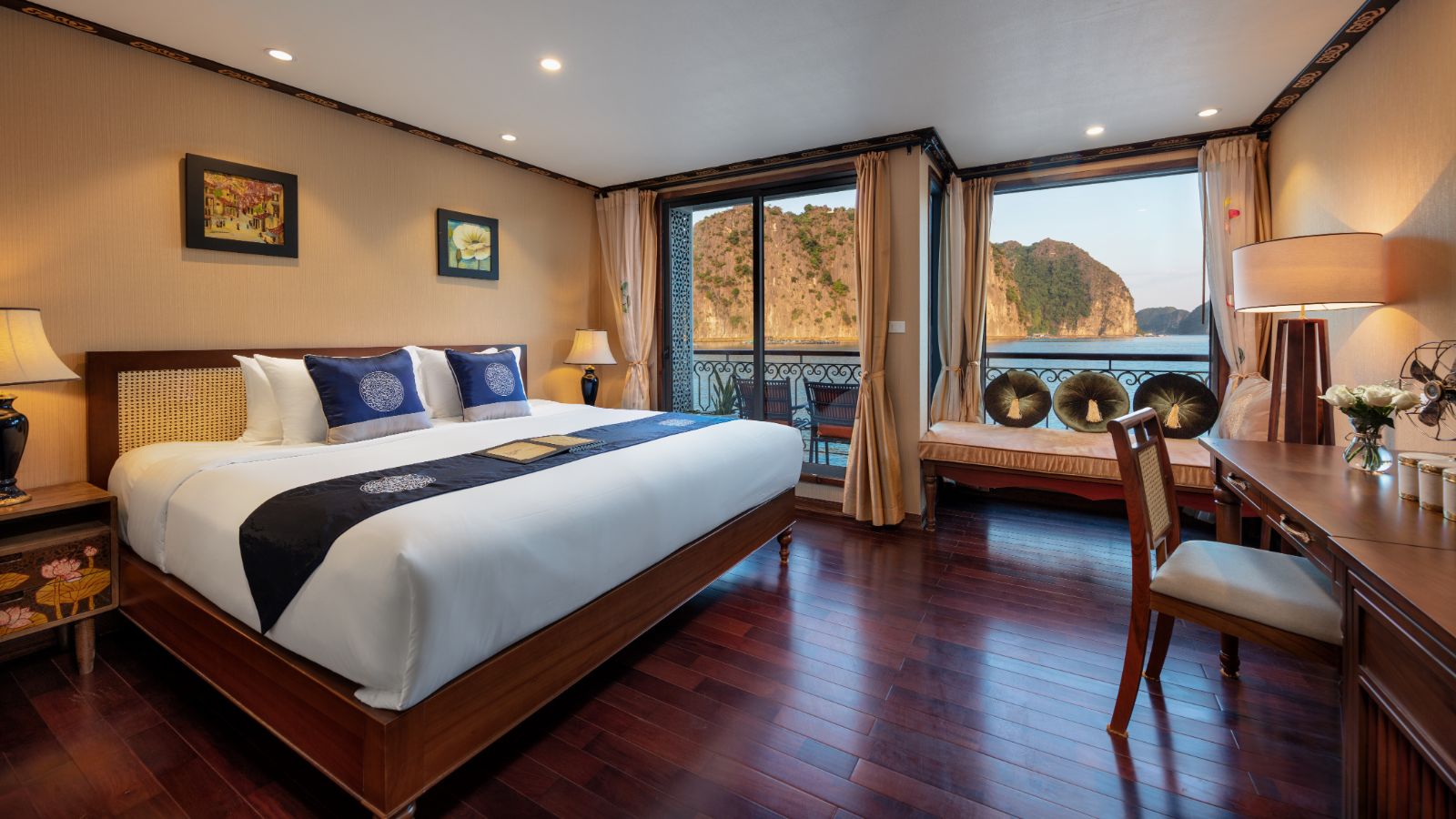 Redesigned in 2023, Indochine Cruise features 45 luxurious cabins blending Indochine-style elegance with modern comforts—highlighted by oak interiors, floor-to-ceiling windows, private balconies, and handcrafted lacquer details. Sail through Lan Ha Bay in style with a 1,100 m² sundeck, fine dining, exclusive lounges, and diverse cabin options for families and guests with special needs. Each suite offers top-tier amenities such as walk-in closets, premium bathrooms, LCD TVs, Wi-Fi,