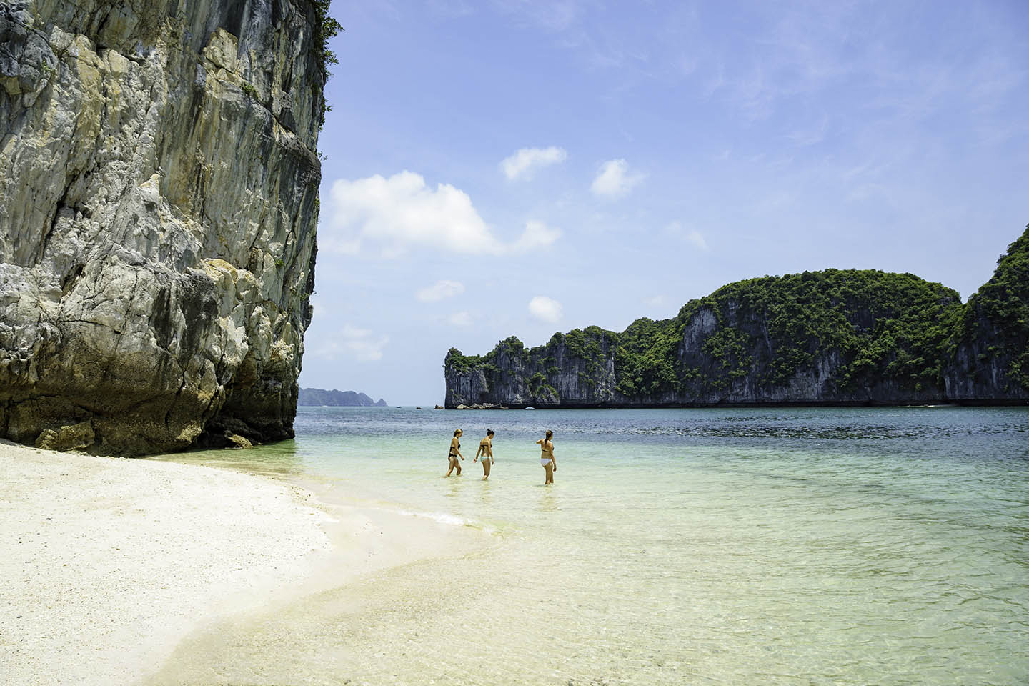 15:30: The cruise approaches Ba Trai Dao (Three Peaches Islets) or the Tra Bau area in Lan Ha Bay, the natural boundary between Ha Long and Hai Phong. This hidden paradise features beaches, cliffs, and the spectacular scenery of over 400 islands. Guests can enjoy kayaking or simply swim in the crystal-clear waters of the bay.