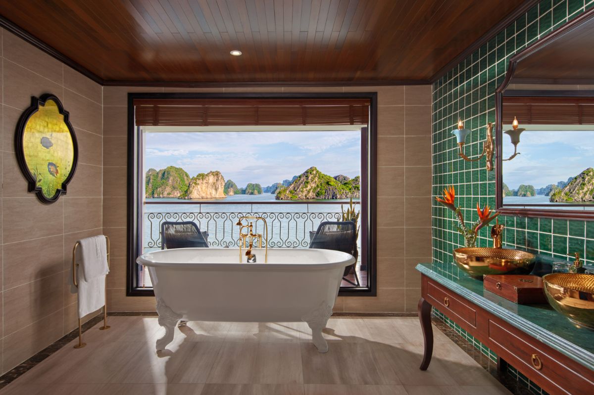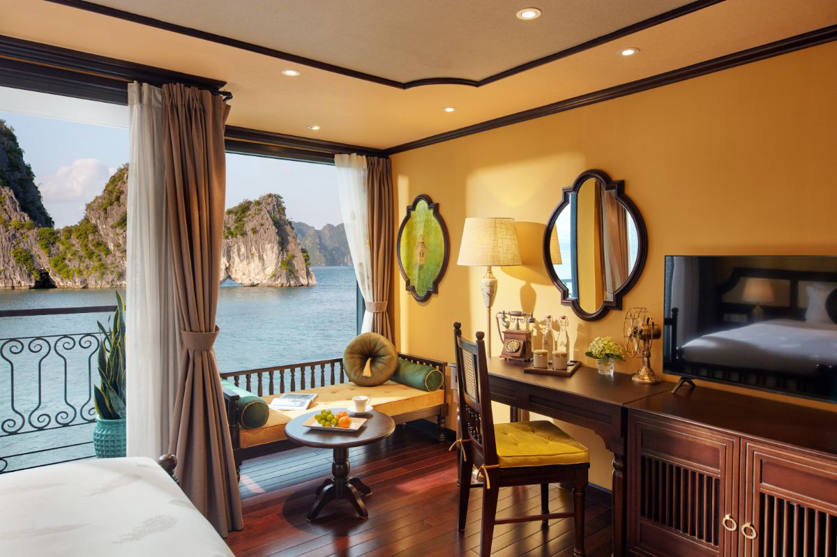 Indochine Premium offers a luxurious all-inclusive cruise with 37 balcony cabins, a 1,100 m² sundeck, pool, mini-golf, and elegant Sky Lounge—perfect for a refined Ha Long Bay escape.